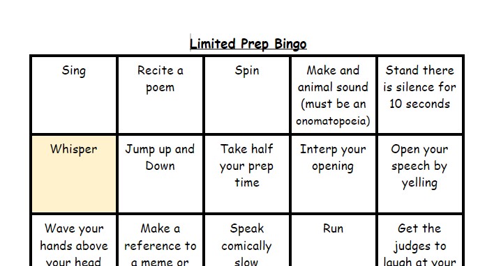 At the third qualifier this past year my and a few of my friends decided to play a game we called impromptu bingo. To play the game we created a 5×5 bingo card of different actions we had to try to include in our limited prep speeches. This included things like opening a speech by yelling, singing, spinning in circles, making animal noises or getting the judges to laugh at your pain. Acknowledging that many of these actions would be really hard to work into our speeches smoothly, we all expected to do worse than normal in that tournament, but that’s not what happened. At the end me and my friends who were playing impromptu bingo took first, second and third in impromptu, and me and the one other person who filled out the entire card both got our best placings in impromptu ever at that tournament. In hindsight, I can see several reasons why impromptu bingo made our speeches so much better that tournament.